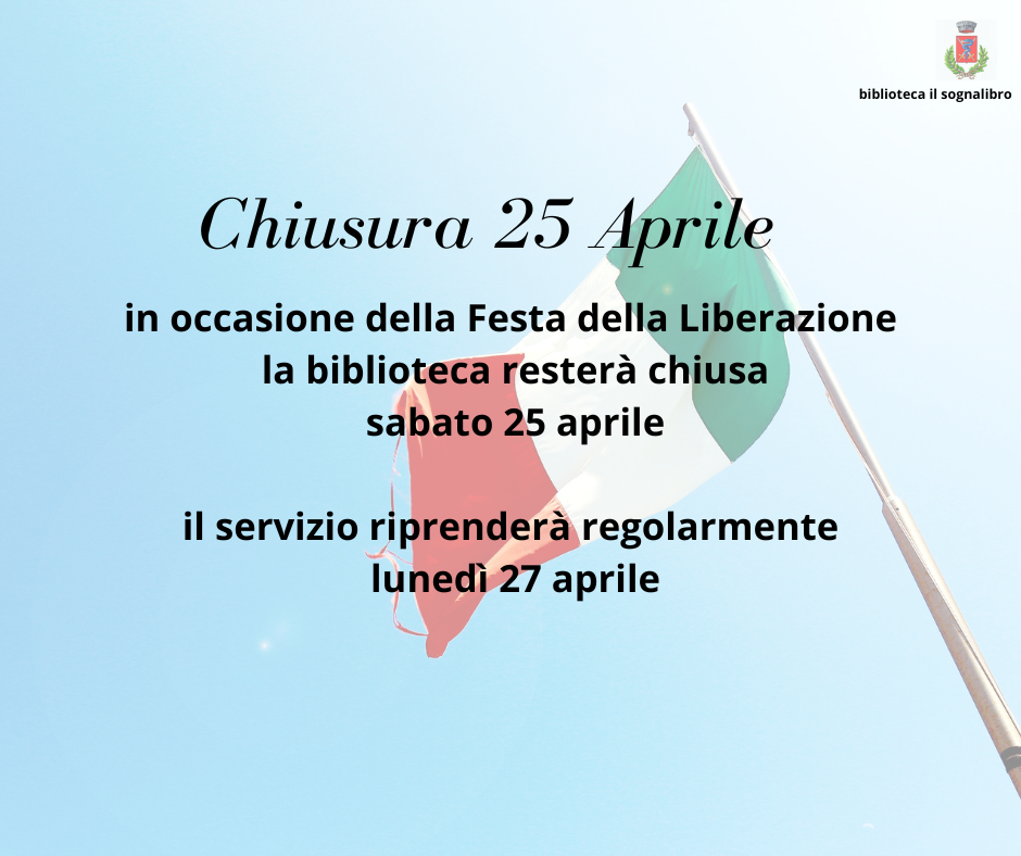 La Biblioteca rimarrà chiusa Sabato 25 Aprile. Il servizio riprenderà Lunedì 27 Aprile