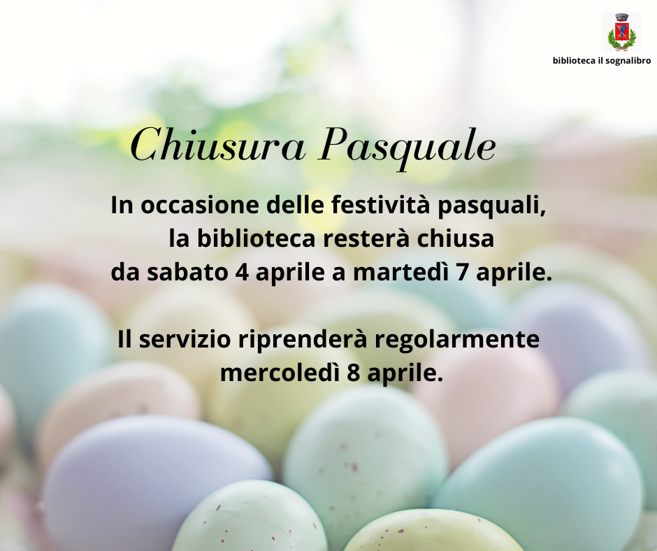 La Biblioteca rimarrà chiusa per le Festività di Pasqua da Sabato 4 Aprile a Martedì 7 Aprile. Il servizio riprenderà Mercoledì 8 Aprile